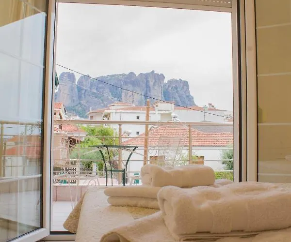 寝室1室のZara'Shomemeteora-The House Of The Rising Sun! カランバカ 別荘はVisit Meteoraから徒歩で5分くらいに位置し、Wi-Fiや無料の専用駐車場などの設備があります。 ルサヌ修道院から3.4キロメートル離れた場所に位置する浴室1室の別荘は、都市の景色を望むテラスが自慢です。